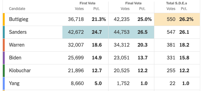 This is true even if you add the results of the other leading candidates together. Looking at the final vote tallies, Sanders and Warren together got 46.8%. Buttigieg, Biden, and Klobuchar together got 50.9%. (I don’t know how to classify Yang.) In the end, the party might coalesce around a more centrist candidate, but that’s by no means guaranteed, and it hints that any centrist candidate will have to reach out to the progressive wing. (Though I suspect their temptation is likely to be telling the progressive wing to suck it and fall in line.)